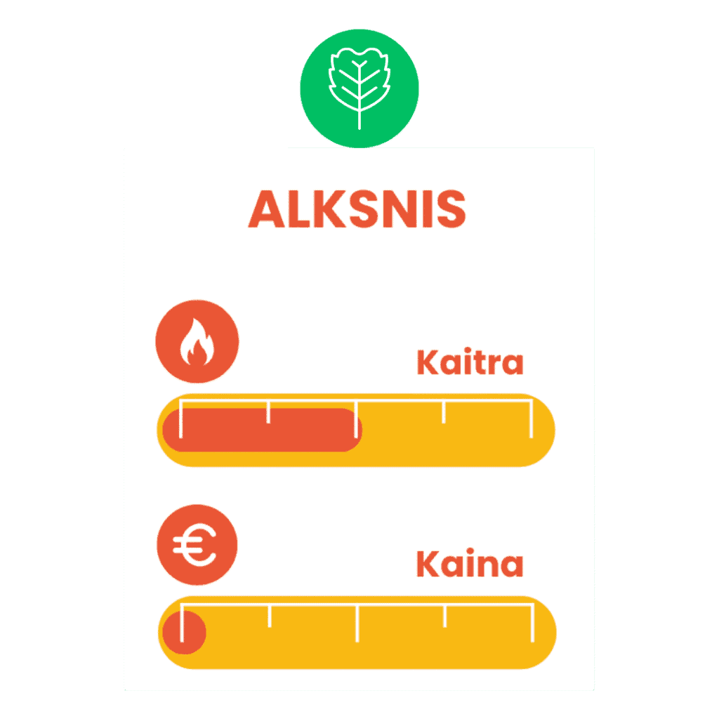 | Alksnis | Vidutinė | Trumpesnė | Užkūrimui, greitam šildymui |