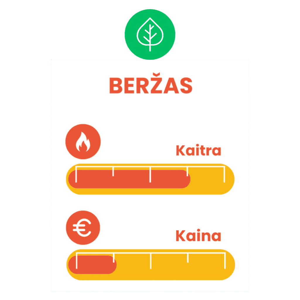 | Beržas | Aukšta | Vidutinė | Kasdieniam kūrenimui |