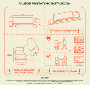 Įsitikinkite, kad jūsų kiemas ir sandėliavimo vieta yra tinkami pristatyti nurodytų gabaritų paletę.Jei paaiškėtų, kad pristatymo vieta netinkama ir dėl to paletę reikėtų grąžinti – būtų taikomas 140 EUR paletės grąžinimo mokestis.